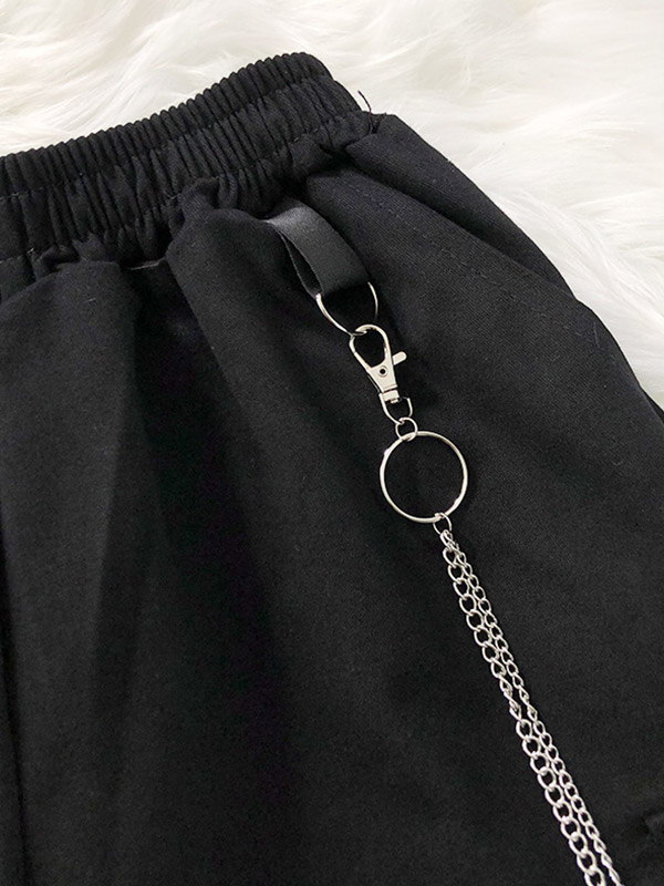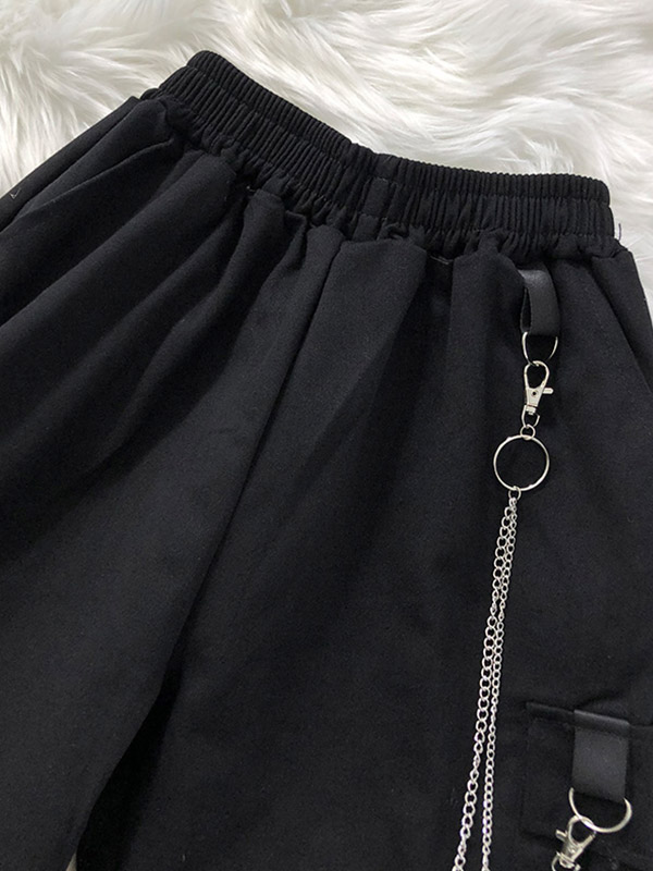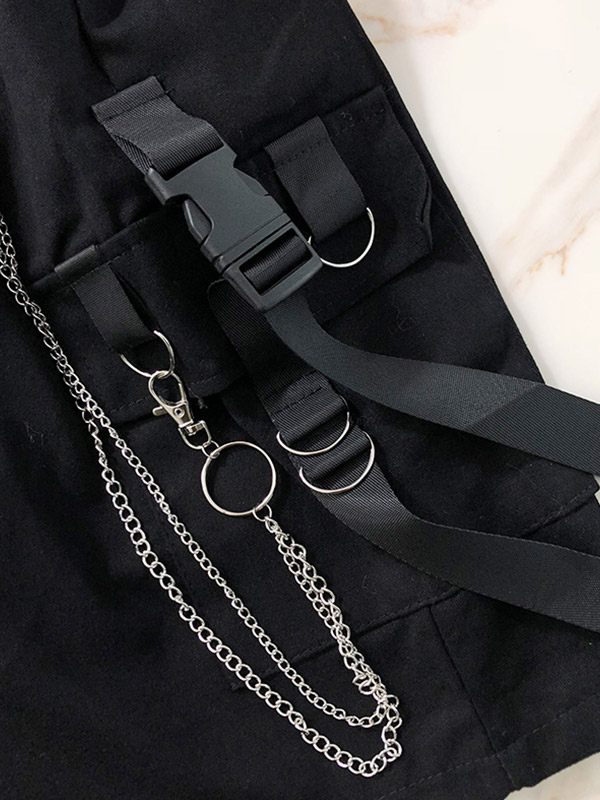 Stil: Casual/Street/Hip Pop/Punk/Grunge Material: Baumwollmischung Passform: Normale Passform Beschreibung: Diese Shorts mit geradem Bein sitzen an einer elastischen Taille, haben mittellange Cargotaschen mit Schnallenriemen Design und abnehmbarer Kette vorne.