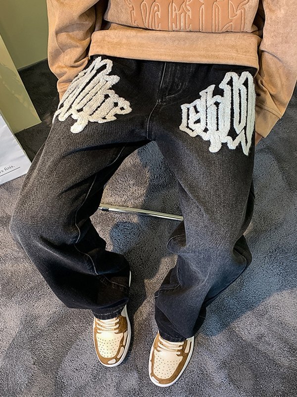 Fuzzy Letter Straight Leg Jeans für Herren